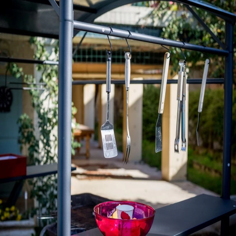 Un point très appréciable : adapté pour vous assurer une agréable liberté de mouvement, afin de pouvoir exercer avec plaisir vos préparations culinaires, cet abri barbecue dispose d’un passage assez confortable d’une hauteur de 218cm.