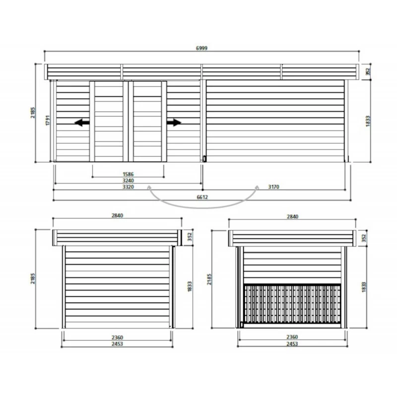 L’abri de jardin Arhus possède un look contemporain et moderne avec sa terrasse couverte, et il pourra être personnalisé pour répondre exactement à vos besoins et à votre inspiration. L’abri a une façade de 332cm comprenant une porte double coulissante exclusive avec 5 panneaux en verre trempé. D’une surface totale de près de 20m², la construction se compose d’un abri fermé de dimensions 332x245cm accolé à une surface couverte de dimensions 317x245cm.