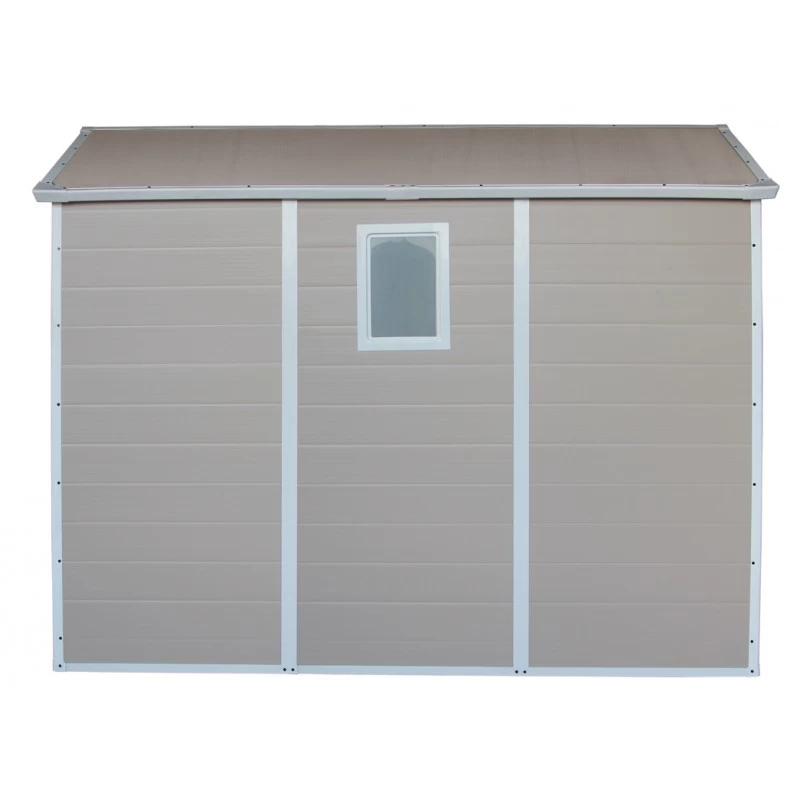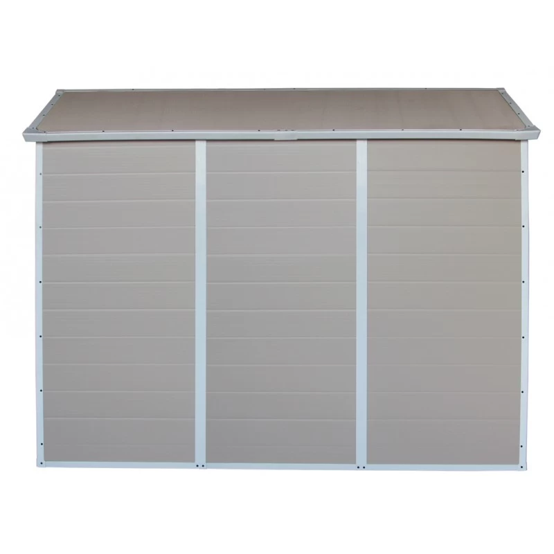 Une large double porte sur la façade de 190cm offre une facilité d’accès et d’utilisation, avec des dimensions agréables de 119x181cm. Avec une profondeur de 280cm, des parois de 184cm et une hauteur faîtière de 226cm, cet abri développe un volume utile de 9,7m³. Combinant les tons beige et blanc, cet abri trouvera harmonieusement sa place dans votre aménagement extérieur.