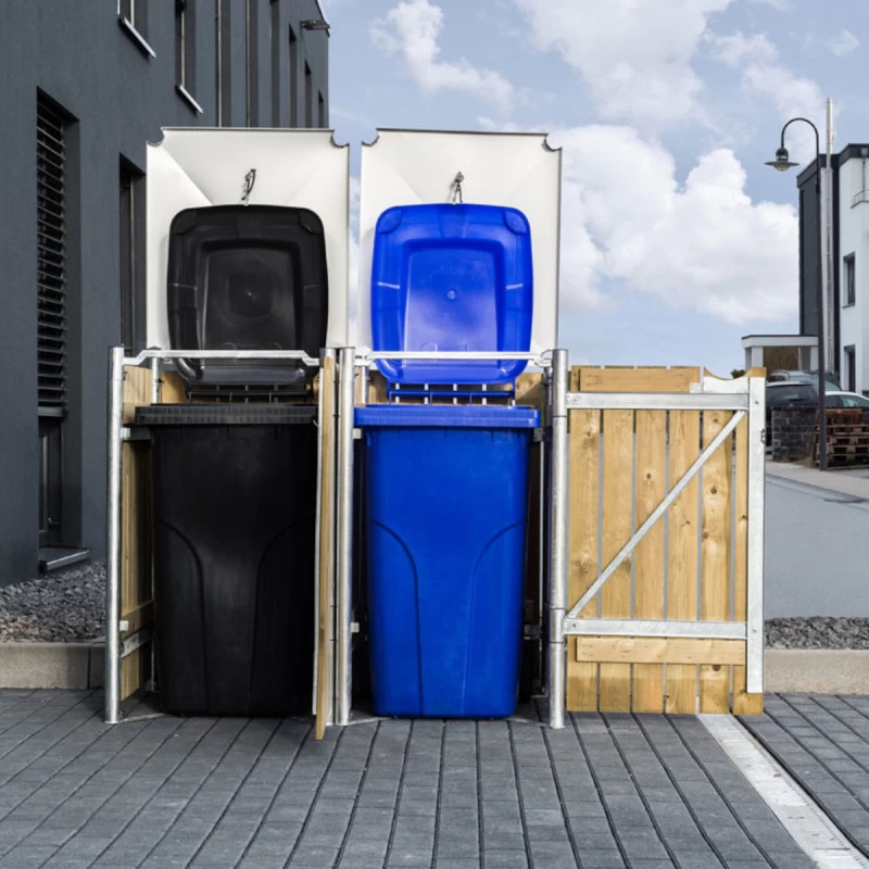 Ce modèle de dimensions 139x81x115cm est conçu pour accueillir deux conteneurs à poubelles de 240L. Chaque compartiment peut être ouvert par le couvercle ou par la face avant. Un crochet muni d’une cordelette situé sous le couvercle actionne automatiquement l’ouverture de chaque compartiment. Les matériaux utilisés sont de grande qualité, et assurent une durabilité exceptionnelle au produit, qui est destiné à un usage en extérieur.