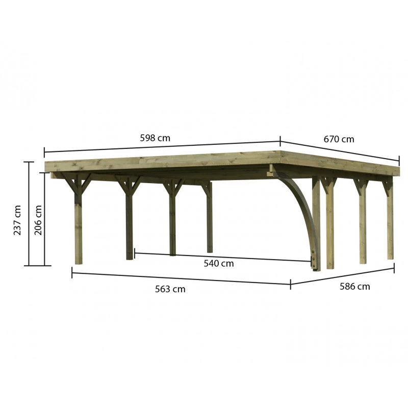Très tendance avec son poteau en arc en entrée, ce carport en bois de la marque Karibu vous offrira une grande surface couverte de 40,2m², parfaite pour vos voitures familiales. Le passage large de 540cm facilite les manœuvres tandis que le toit en panneaux PVC robuste assure une meilleure protection contre les pluies.