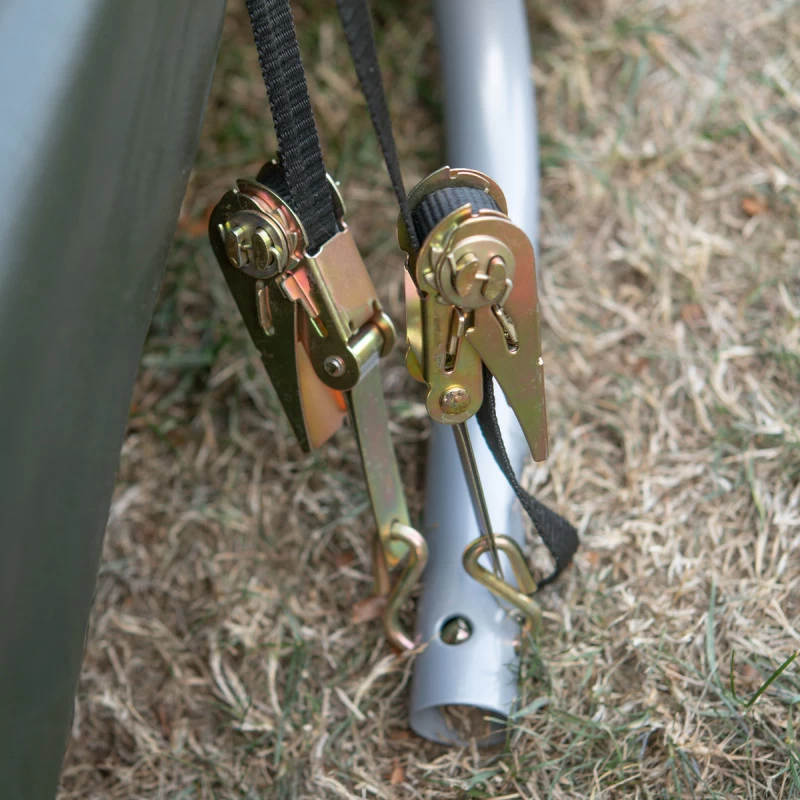 La toile est maintenue en place solidement grâce aux sangles d’arrimage à cliquet qui se fixent sur la structure. Pour une tension optimale de la toile, le système de traverses coulissantes se verrouille et positionne la structure pour qu’elle demeure parfaitement ajustée à la bâche. Cet abri démontable s’installe rapidement et ne requiert aucun outillage spécifique. Il peut être utilisé de manière saisonnière ou tout au long de l’année. L’installation doit se faire sur un sol relativement nivelé avec les 4 pieds d’ancrage fournis.