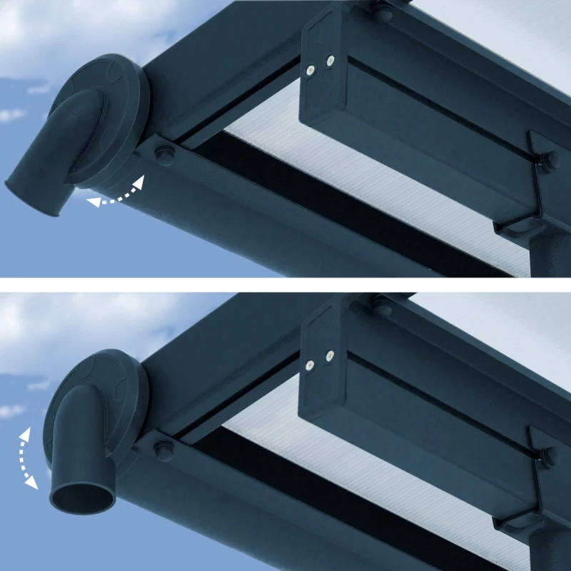 Le cadre en aluminium inoxydable gris anthracite est peint par poudrage et résiste à la rouille. Les pieds sont ajustables latéralement par rapport aux extrémités et les hauteurs à l’avant et à l’arrière sont également modulables. La barre d’accroche faîtière peut être installée à une hauteur variant de 266 à 300cm et la partie avant à une hauteur variant de 210 à 216cm. Les différents réglages modifient l’inclinaison de la pente de la toiture dont la valeur peut être comprise entre 10 et 20° en fonction de l’enneigement et de la configuration de votre terrasse.