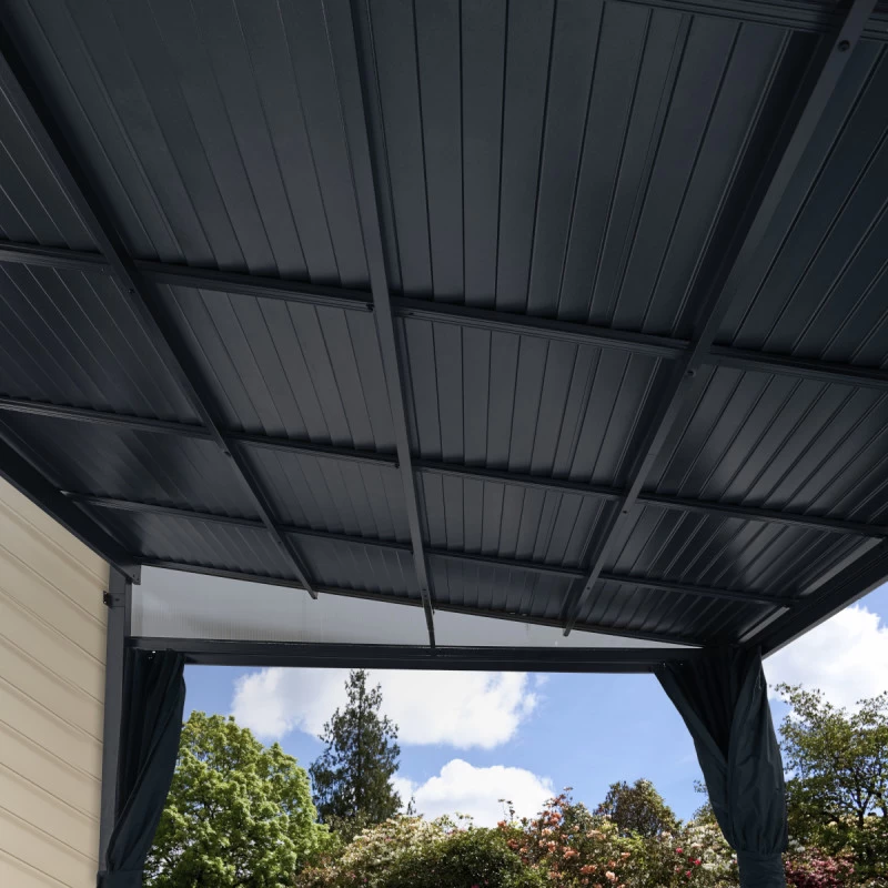 Avec une profondeur de 298cm pour une longueur de 363cm, la tonnelle adossée Portland vous offre un espace supplémentaire, une transition agréable entre l’intérieur et l’extérieur. Cette tonnelle d’une hauteur maximale de 240cm vous protégera des chaleurs excessives ou vous permettra de profiter de votre terrasse lorsque le ciel est maussade ou pluvieux. Ce modèle qui vous est proposé par le spécialiste canadien Sojag dispose d’une structure robuste en aluminium thermolaqué, garanti 5 ans contre la corrosion, avec des poteaux de soutien de 76mm de section.