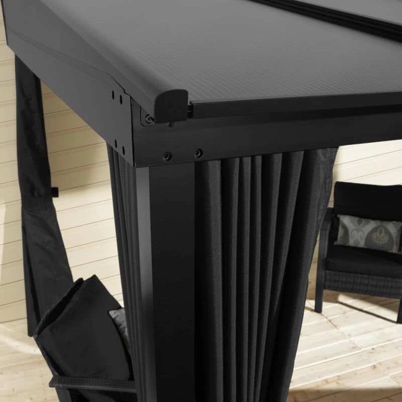 La tonnelle adossée St. Barth est livrée avec un ensemble de moustiquaires et un complet de rideaux en polyester épais d’une densité de 180g/m². Vous pourrez profiter sereinement de vos soirées sans vous préoccuper des insectes nuisibles ou du regard de vos voisins, puisque moustiquaires et rideaux peuvent être installés simultanément grâce au système de double rail. Avec la visserie en acier inoxydable fournie, la tonnelle ne craint pas les conditions hivernales et ne devra pas être remisée. Les poteaux sont pré-percés en usine pour l’ancrage (non inclus) qui dépendra du support de votre terrasse.