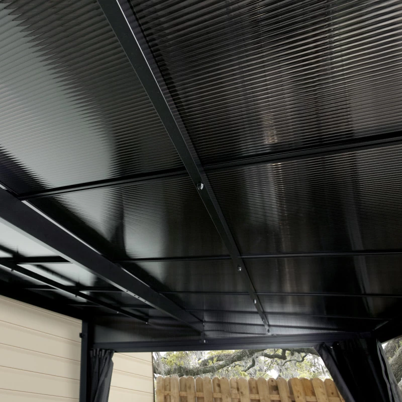 La toiture est constituée de panneaux en polycarbonate à double paroi de 8mm d’épaisseur teintés, et celle-ci peut soutenir une charge de neige de 125kg/m². Il est cependant conseillé d’évacuer la neige pour éviter une accumulation excessive. Les panneaux sont traités contre le rayonnement UV, et la toiture est inclinée pour une évacuation optimale de l’eau de pluie.