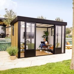 La hauteur à l’avant est de 212cm, et la hauteur faîtière (accolée à la maison) peut varier de 285 à 310cm, pour s’adapter au mieux à la configuration des lieux. La longueur est de 305cm pour une profondeur d’environ 300cm. Trois doubles portes coulissantes verrouillables de 120cm de largeur sur 203cm de hauteur assurent une totale liberté d’utilisation et de déplacements.